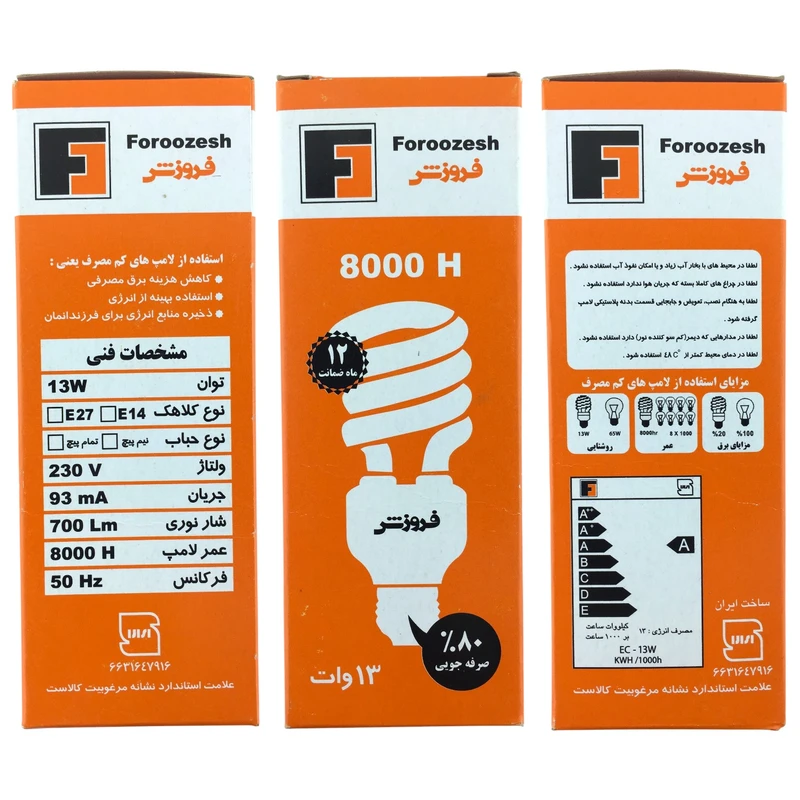 لامپ کممصرف 13 وات «فروزش» مدل تمام پیچ با پایه E14 دارای نشان استاندارد ملی ایران با شماره (6631647916) میباشد که گواه میزان روشنایی مناسب ، مصرف انرژی پایین ، طراحی ساده و کاربردی به همراه طول عمر بالا است که از قیمت مناسبی هم بهره میبرد . این لامپ کممصرف ، با توان مصرفی نسبتا پایین (13 وات) برای مصارف خانگی و حتی اداری تولید شده است . همچنین طول عمر این محصول به میزان متوسط 8 هزار ساعت میرسد . لازم به ذکر است که پایهی این مدل از نوع E14 یا همان شمعی است که معمولا برای لوستر ها کاربرد دارد . شار نوری این محصول 700 لومن - جریان 93mA - فرکانس 50Hz - و رده مصرف انرژی A میباشد .