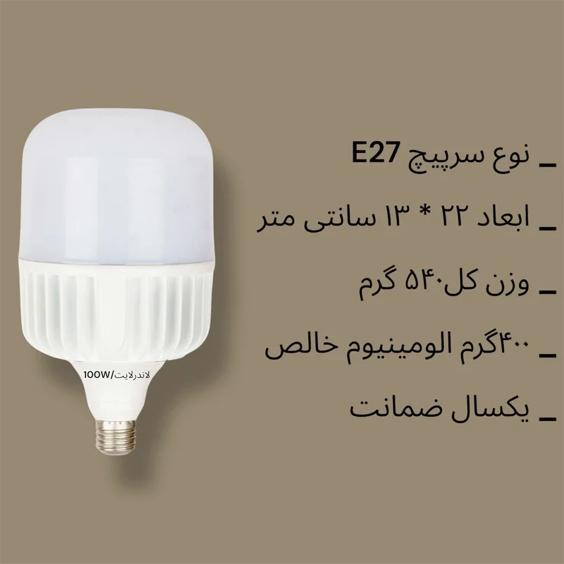 لامپ های ال ای دی 100 وات گزینهای عالی برای روشنایی با مصرف انرژی کم و عمر طولانی هستند. این لامپ دارای پایه E27 بوده و با طراحی استوانهای دارای راندمان بالا و بدون پرتوهای مادون قرمز و ماورابنفش است. همچنین با ولتاژ 100 تا 240 ولت سازگار بوده و طول عمر 25,000 ساعت دارد.