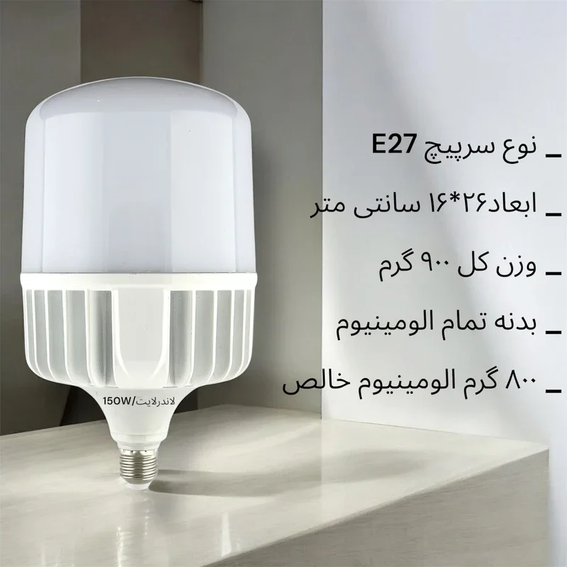 لامپ های ال ای دی 150 وات گزینهای عالی برای روشنایی با مصرف انرژی کم و عمر طولانی هستند. این لامپ دارای پایه E27 بوده و با طراحی استوانهای دارای راندمان بالا و بدون پرتوهای مادون قرمز و ماورابنفش است. همچنین با ولتاژ 100 تا 240 ولت سازگار بوده و طول عمر 25,000 ساعت دارد.