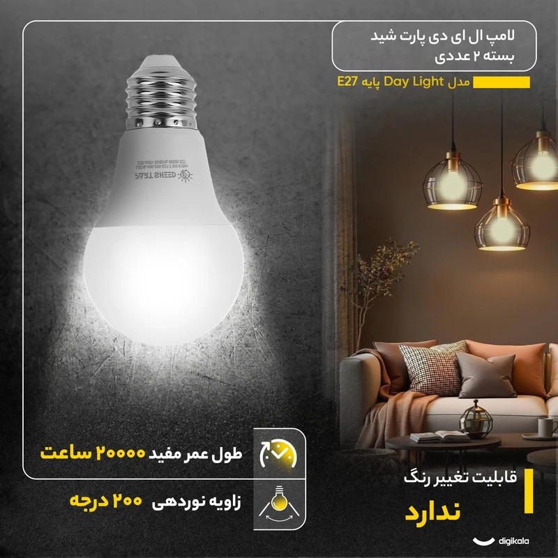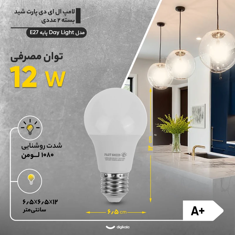 با ضمانت معتبر تا 1406/02، از کیفیت و دوام بینظیر این محصول مطمئن شوید. برای روشن کردن فضا با نوری شفاف و کافی، لامپ ال ای دی 12 وات پارت شید مدل Day Light یک انتخاب مناسب و کارآمد است. این لامپ با بهرهگیری از فناوری LED، شدت روشنایی بالایی معادل ۱۰۸۰ لومن را با مصرف 12 وات انرژی تولید میکند. این بازدهی خوب، آن را در رده مصرف انرژی A+ قرار میدهد و جایگزین مناسبی برای لامپهای پرمصرف قدیمی محسوب میشود. طول عمر مفید این محصول ۲۰,۰۰۰ ساعت است که به معنای سالها استفاده بدون نیاز به تعویض مکرر است. نور ثابت و مهتابی رنگ آن با زاویه تابش ۲۰۰ درجه، روشنایی خوبی را برای محیط فراهم میکند و برای فضاهایی مانند فروشگاهها، انبارها و کارگاهها مناسب است. این لامپ حبابی با ابعاد ۶.۵x۶.۵x۱۲ سانتیمتر وزن ۲۵ گرم، دارای پایه E27 است که نصب آن را در اکثر سرپیچهای رایج آسان میکند. در نهایت، لامپ ال ای دی 12 وات پارت شید با توجه به روشنایی بالا و طول عمر زیاد، یک راهکار روشنایی به صرفه و کارآمد محسوب میشود.