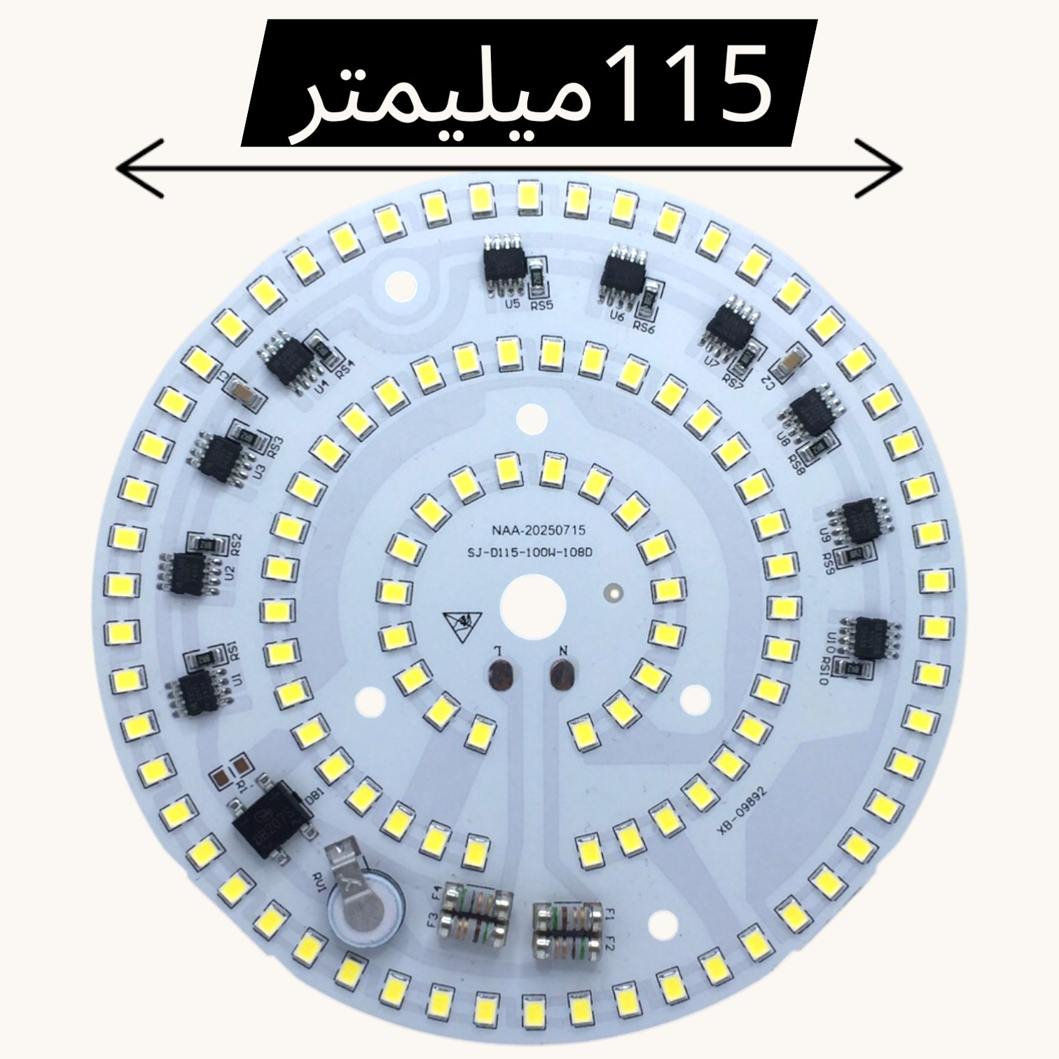 چیپ ال ای دی 100 وات دایرهای مدل SJ مناسب پروژکتور و چراغ سقف یچیپ ال ای دی 100 وات یک ماژول نوری پرقدرت و آماده استفاده است که برای ساخت و تعمیر انواع پروژکتور، چراغ سقفی، روشنایی صنعتی و کارگاهی کاربرد دارد. این چیپ از نوع SJ (Driver On Board) بوده و درایور آن روی برد قرار دارد، بنابراین بدون نیاز به درایور خارجی و مستقیماً با برق شهری راهاندازی میشود.استفاده از تعداد زیاد LEDهای SMD با کیفیت، باعث ایجاد نور یکنواخت، شار نوری بالا و مصرف انرژی بهینه شده است. همچنین برد آلومینیومی این محصول به دفع بهتر حرارت و افزایش طول عمر کمک میکند.ویژگیها و مشخصات:توان: 100 واتنوع: SJ (بدون نیاز به درایور جداگانه)ولتاژ ورودی: 220 ولت ACشکل: دایرهاینوع LED: SMD پرنورنوردهی: بسیار زیاد و یکنواختجنس برد: آلومینیومی (خنککنندگی بهتر)طول عمر: بالانصب آسانکاربردها:پروژکتور LEDچراغ سقفی و کارگاهیروشنایی صنعتیچراغ خیابانیتعمیر و ساخت انواع چراغ LEDنکات مهم:حتماً روی هیتسینک مناسب نصب شوداستفاده از خمیر سیلیکون برای انتقال بهتر حرارت توصیه میشود
